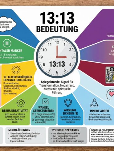 Du siehst immer wieder 13:13 auf der Uhr? Diese Spiegelstunde gilt in der spirituellen Numerologie, in der Engeldeutung und im Tarot als verdichtetes Signal für Transformation, Neuanfang, Kreativität und spirituelle Führung. Im Folgenden findest du eine nüchterne, strukturierte und zugleich tiefgehende Einordnung der 13:13 Bedeutung – inklusive numerologischer Herleitung, Engelsaspekten (insbesondere Schutzengel Yeiazel), Liebes- und …