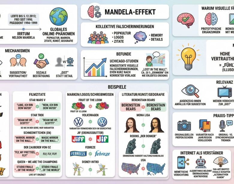 Merke: Hohe Vertrautheit + plausible Ergänzung = „fühlt sich echt an“. Genau hier gedeiht der Mandela-Effekt.